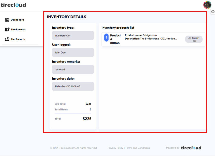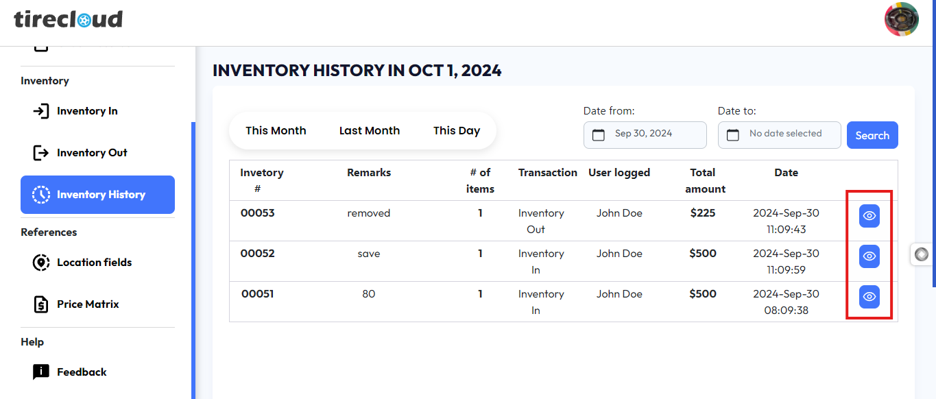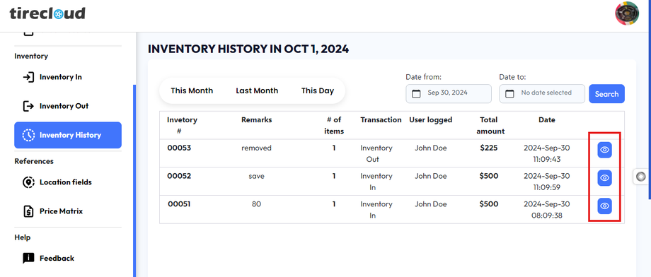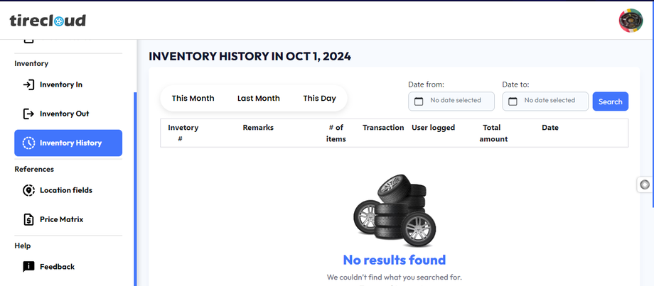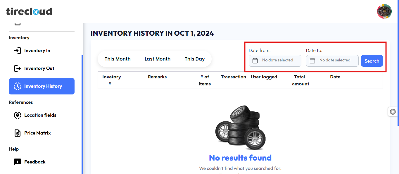 The Inventory History page allows users to track the history of tire inventory activities for a selected period. Users can view detailed records of past inventory transactions, including the following: