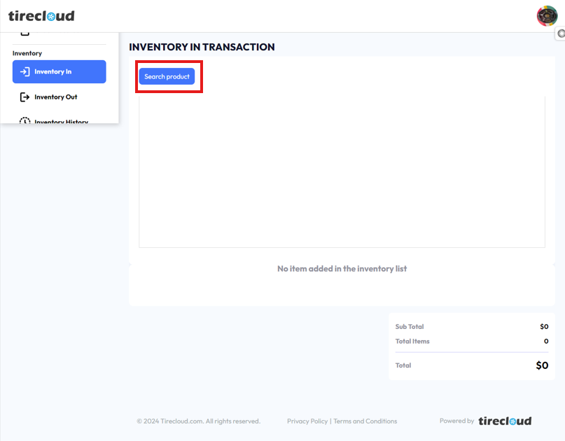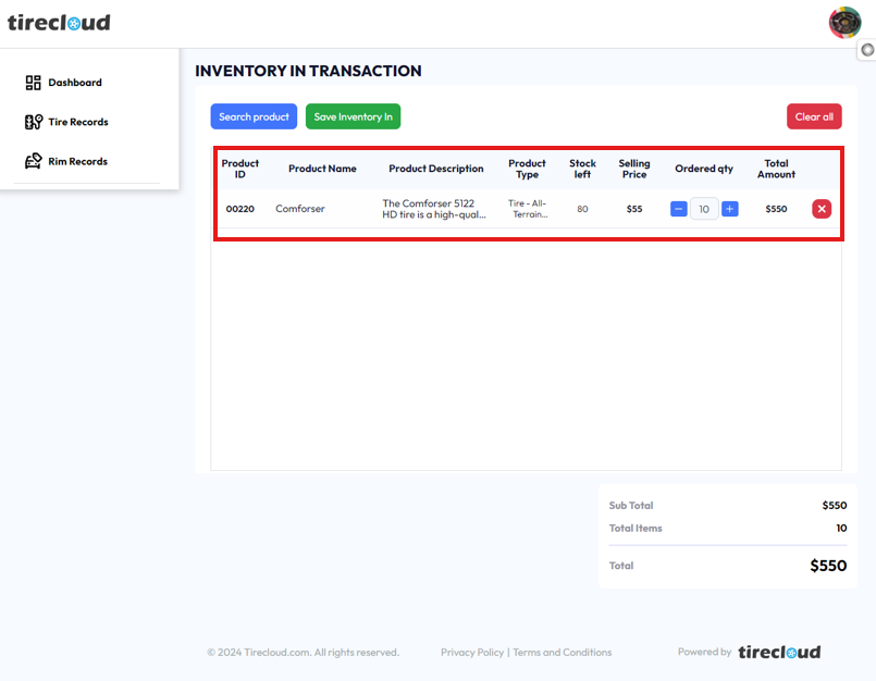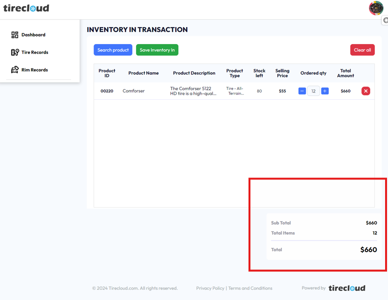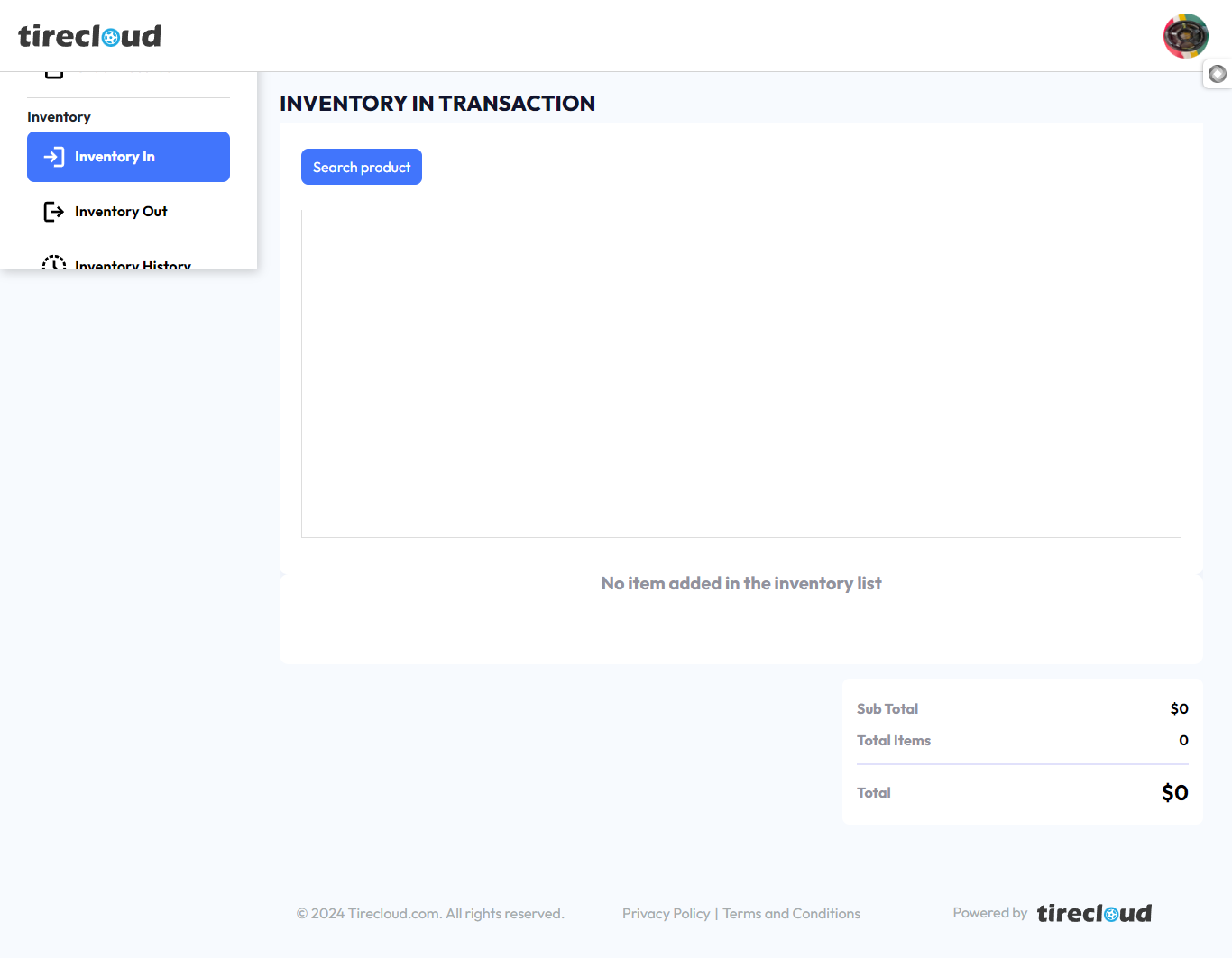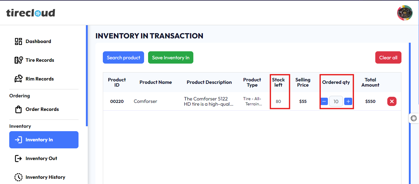 The Inventory In feature in Tire Cloud allows users to add and manage incoming inventory efficiently. This functionality is crucial for keeping track of stock levels and ensuring the system accurately reflects the current product availability.