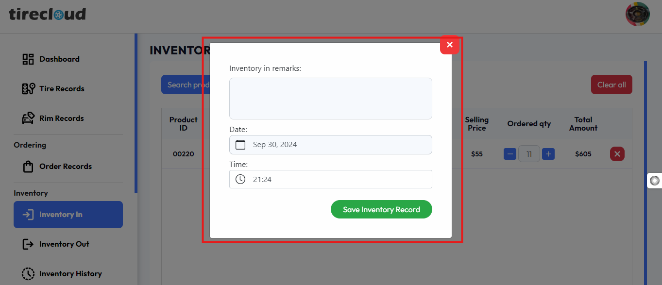 On the pop-up window, a date and time will automatically add and inventory remarks where you can add a message, click the green Save Inventory Record to save your Inventory in quantity value that you want to add to your stock.