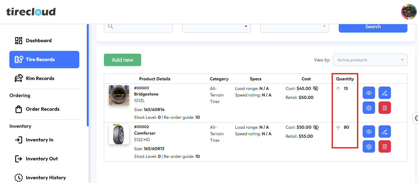 As you can see in the picture below the tire record is the quantity or the stock of the product this guide will help you update your stock or add a stock quantity to your Inventory In.