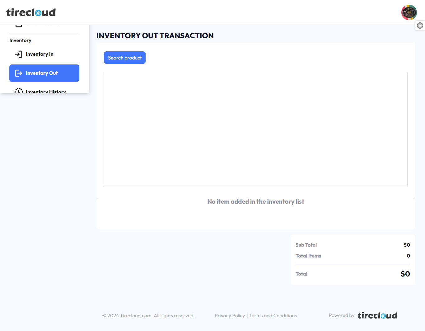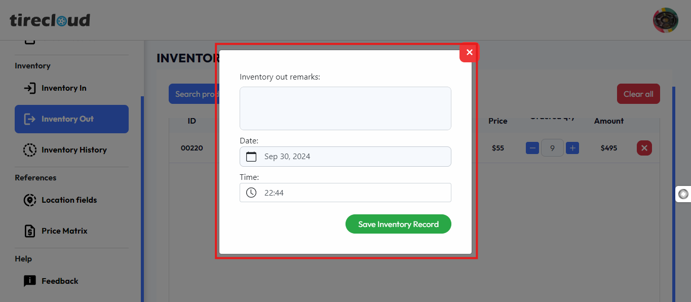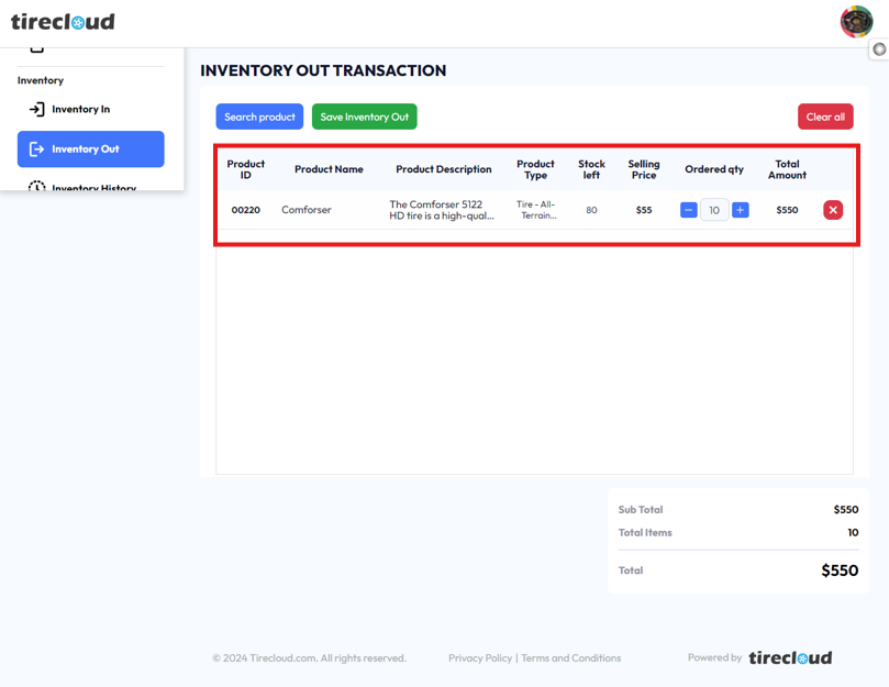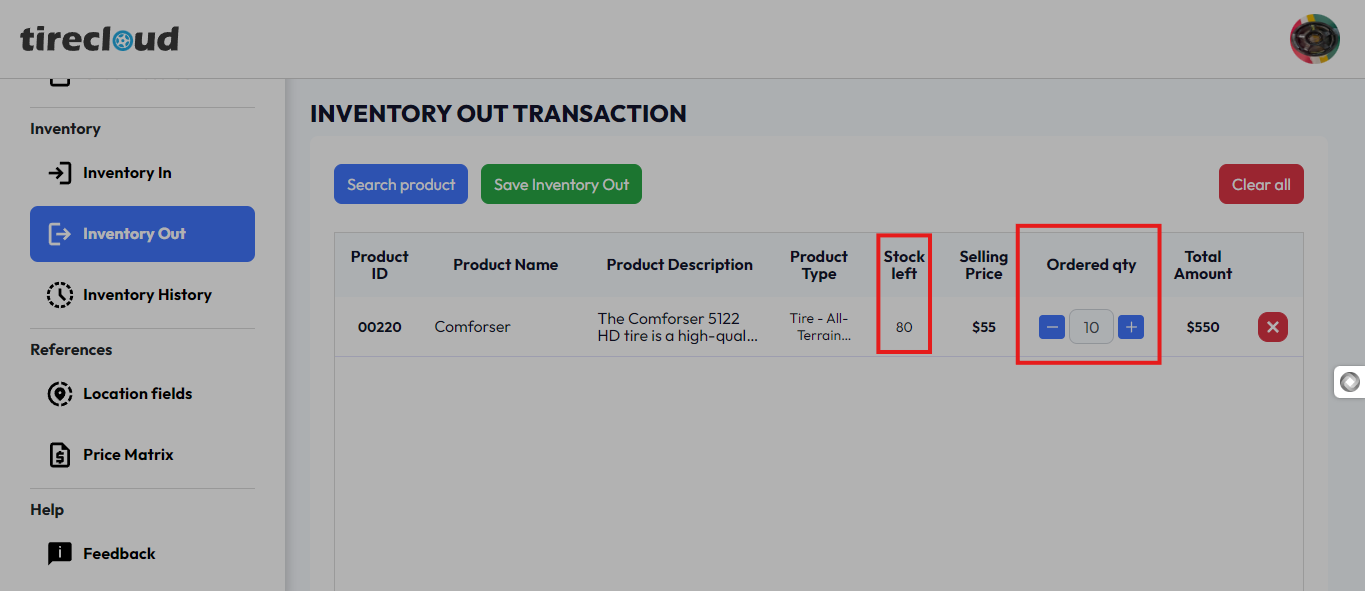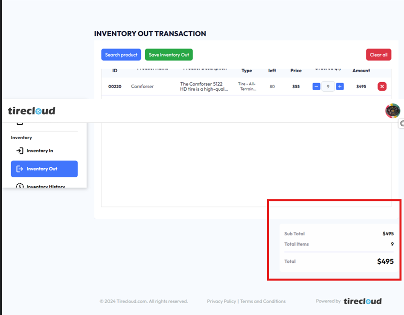 The Inventory Out transaction feature in Tire Cloud enables users to efficiently manage and track products that are leaving the inventory, this process ensures that the system accurately reflects the reduction in stock levels, helping businesses maintain real-time inventory updates.