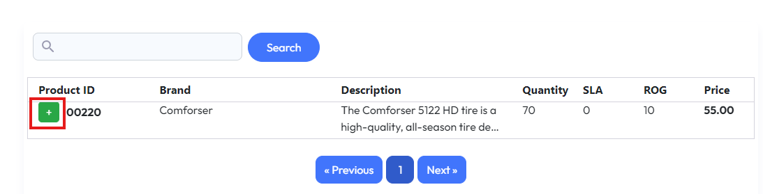 When the search results appear, you can add an item to the Inventory in Transaction list by clicking the green plus (+) button next to the Product ID.