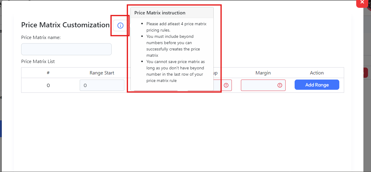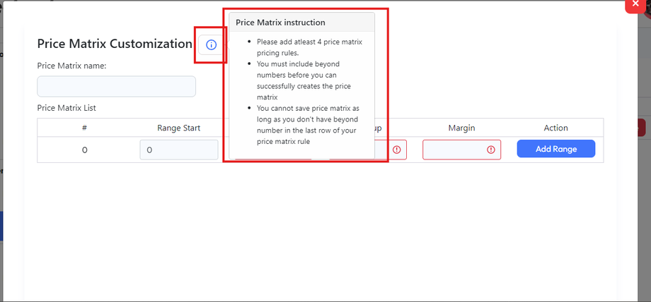 Blue Button (Customize Price Matrix) clicking this button will open a popup window for customizing the price matrix