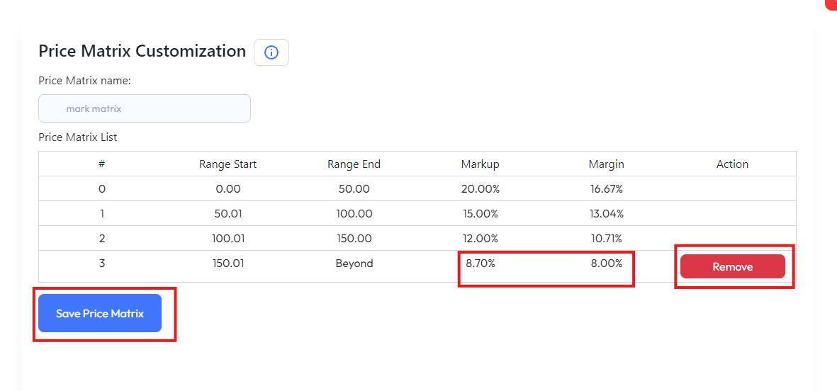 5. Once all the pricing rules have been finalized Click Save Price Matrix to save your price matrix