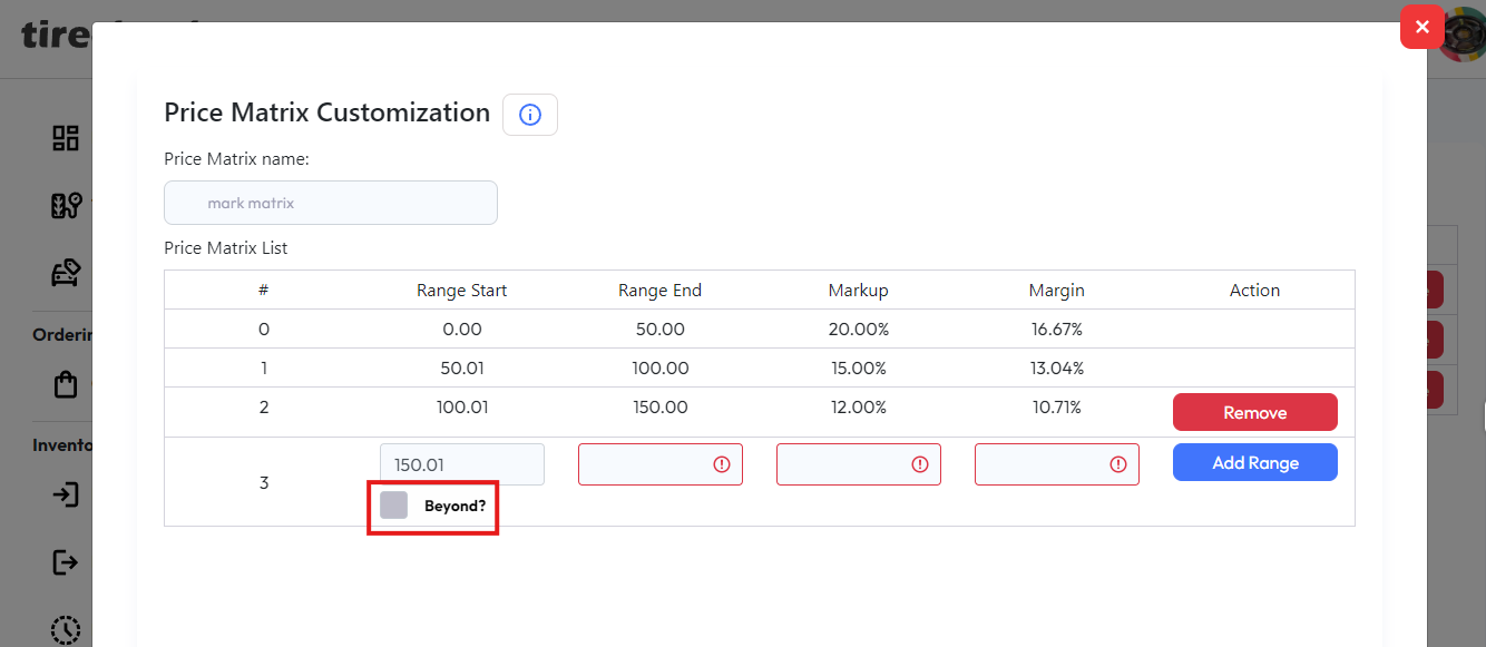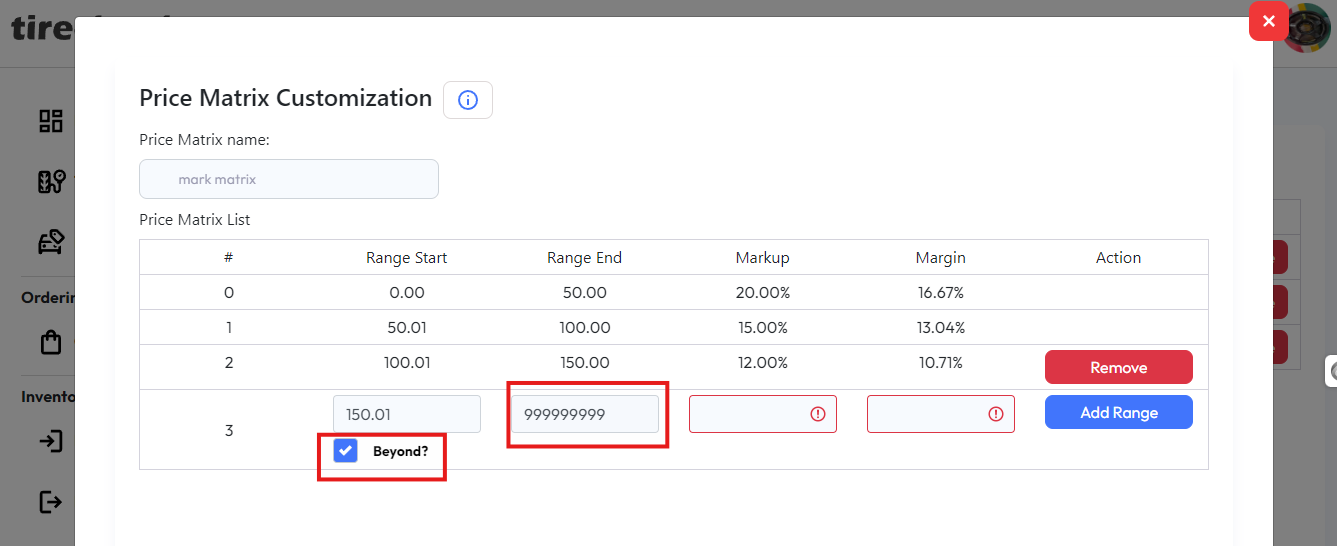3. Once the 4 price matrix pricing rule is added a checkbox for beyond will appear checking the checkbox will put beyond/999999999 on the range end