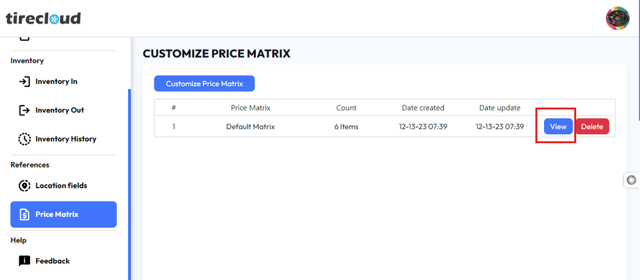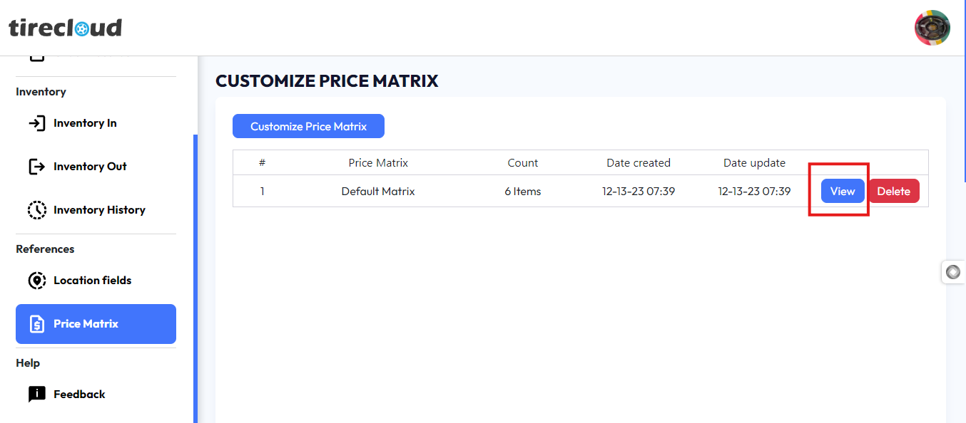 To explain the Tire Cloud price matrix, click the blue view button on the right corner of the table