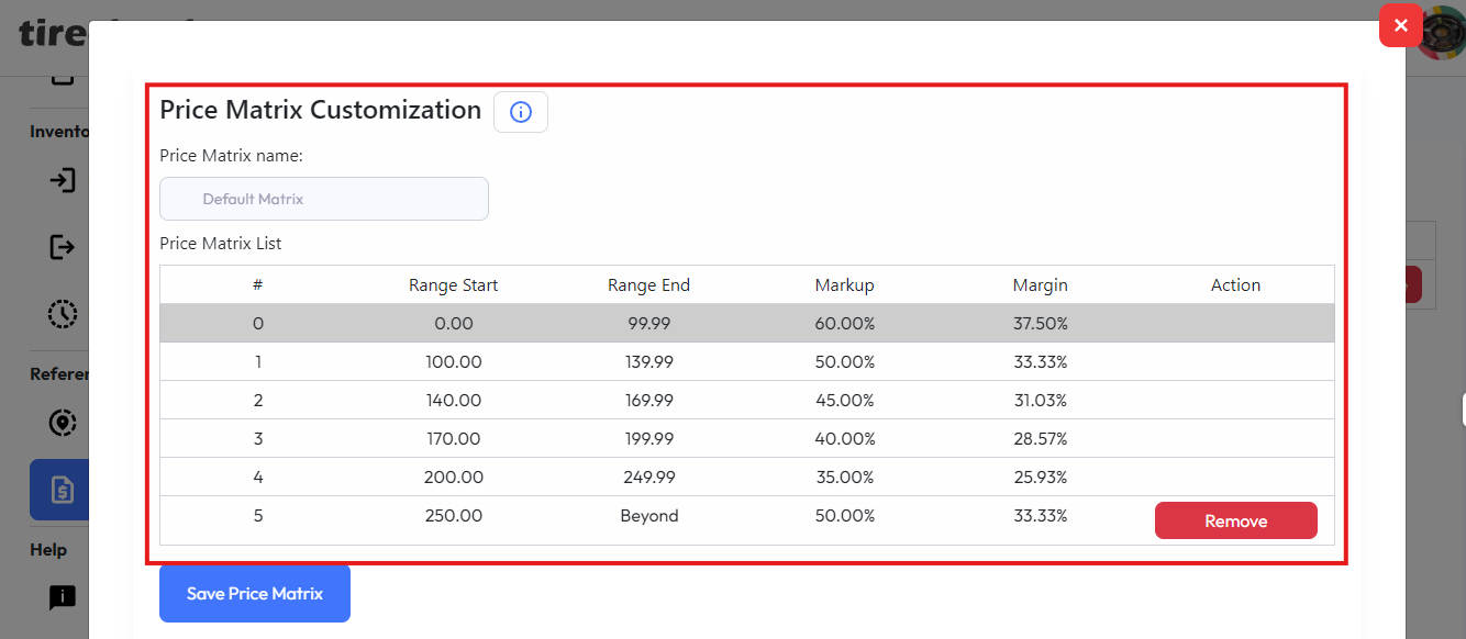 In the image, you are looking at a Price Matrix Customization table, which breaks down pricing into ranges based on price points, along with markup and margin values. Let’s go over the key components: