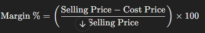 Margin % = (Selling Price - Cost Price) ÷ Selling Price × 100