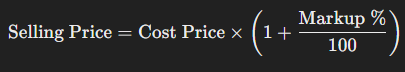 Markup (%): This is the percentage increase added to the base cost of the product to determine the selling price. The formula for calculating the selling price with markup is: