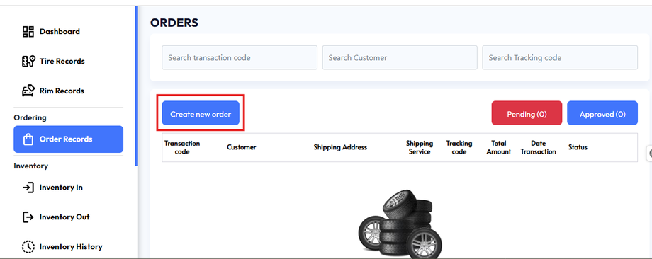Create new order: This button, located on the left in blue, lets users create and submit a new order. When clicked, it opens a form for entering order details such as customer information, shipping address, and product details.