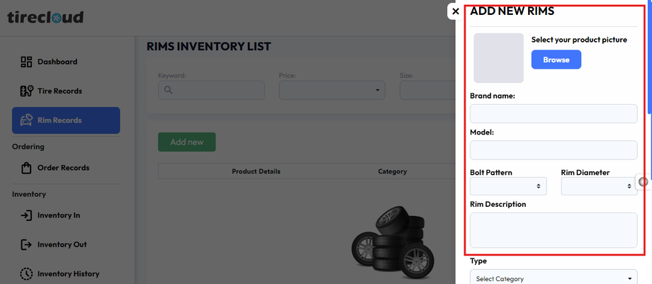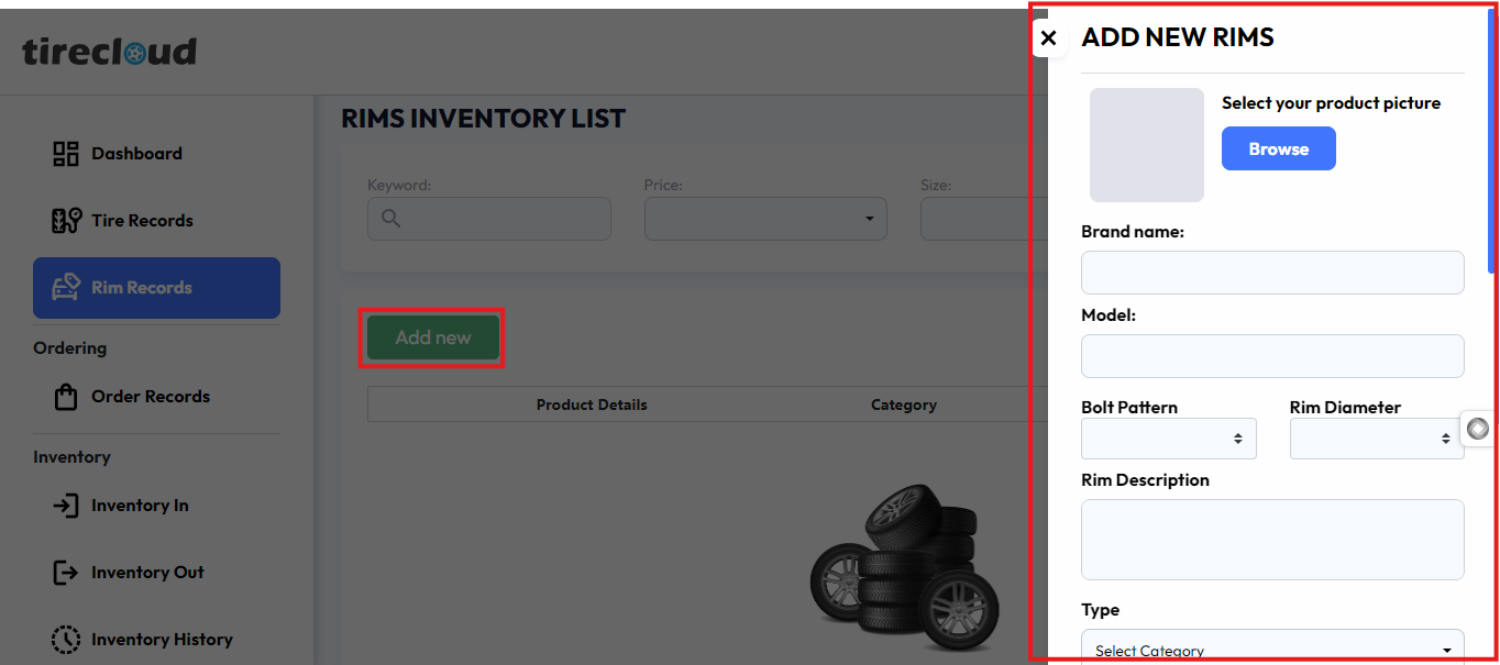 To add a rim to the inventory, navigate to the Rim Record click the “Add New” and the Add New Rims Form will open