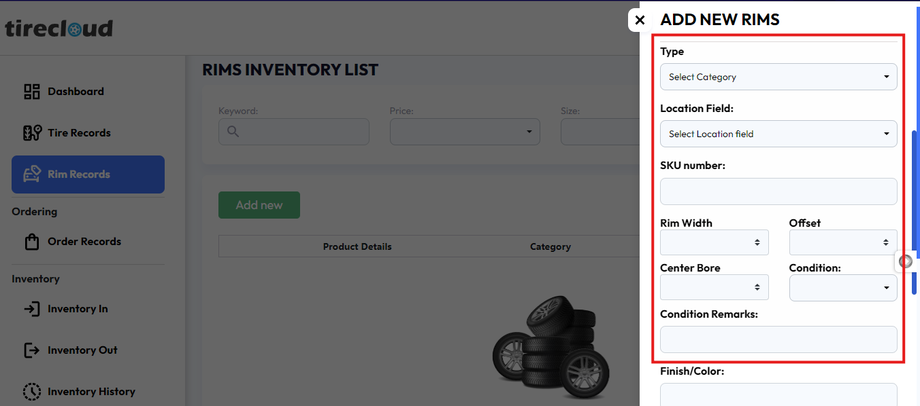 Follow these simple steps to add a rim to your inventory list. This guide will help you fill out each field correctly, ensuring all necessary information is included for easy tracking and sales management.