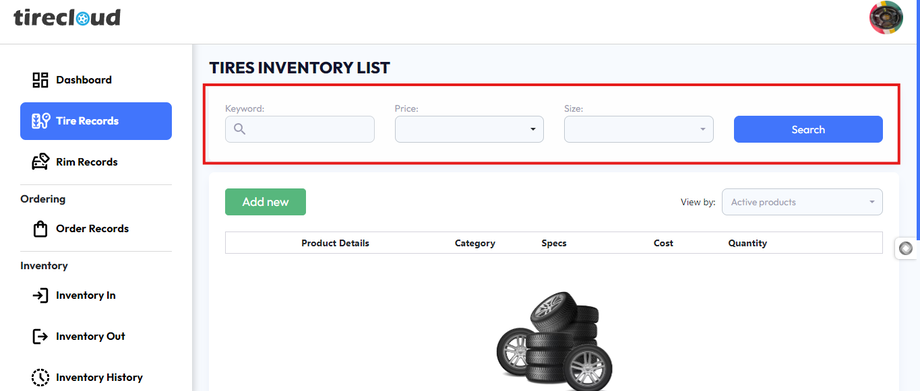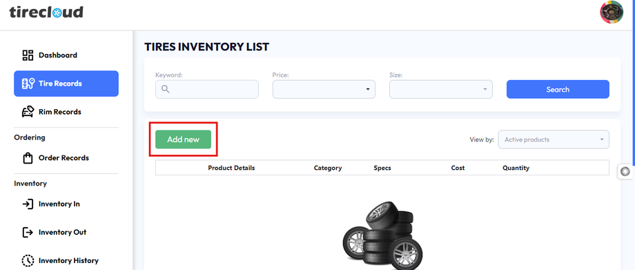 The green "Add new" button enables users to quickly add a new tire product to the inventory by inputting details such as product information, category, cost, and quantity.